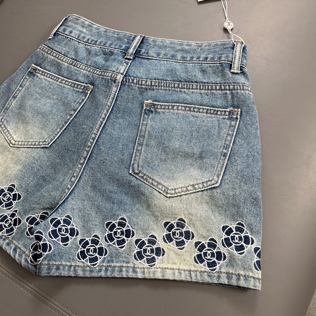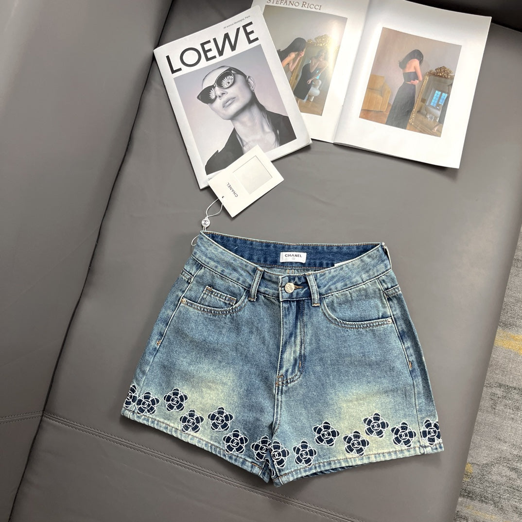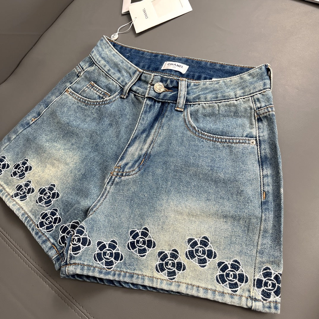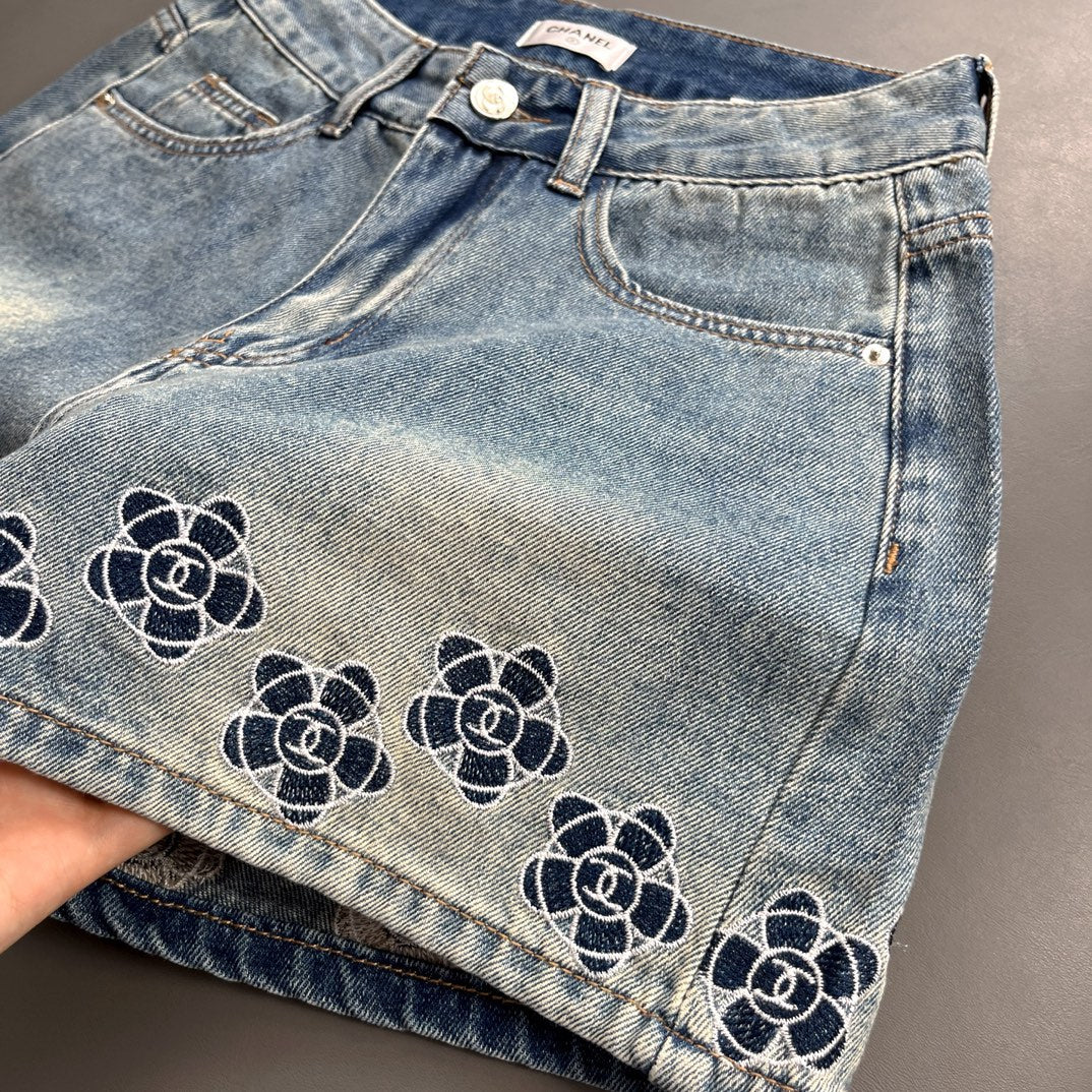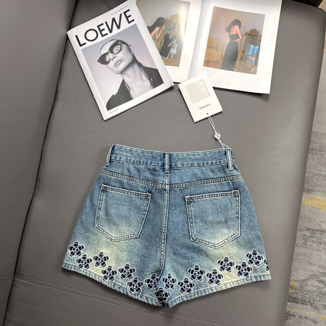 Camellia embroidered denim shorts