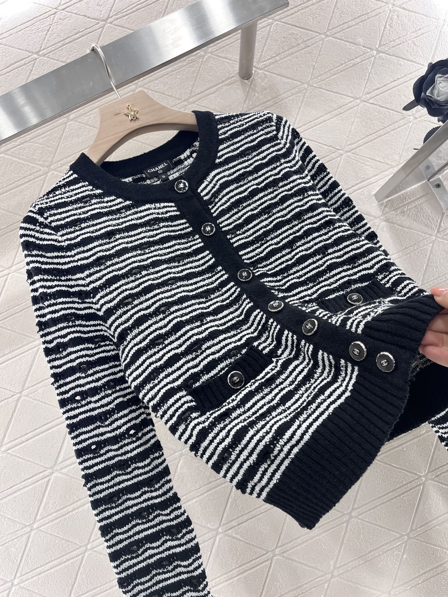 Made of pure cotton yarn, soft and comfortable, stylish and slimming. Round neck cardigan cut, straight shoulder style, slimming and slimming. Contrast color edging decoration on the front and large striped crochet texture as the design highlight. Create a classic and elegant celebrity style. Paired with engraved round buttons, showing the noble temperament of Xiangjia. It can be worn alone or layered. Accompany you through the early spring season change. A must-have item in the wardrobe for all seasons